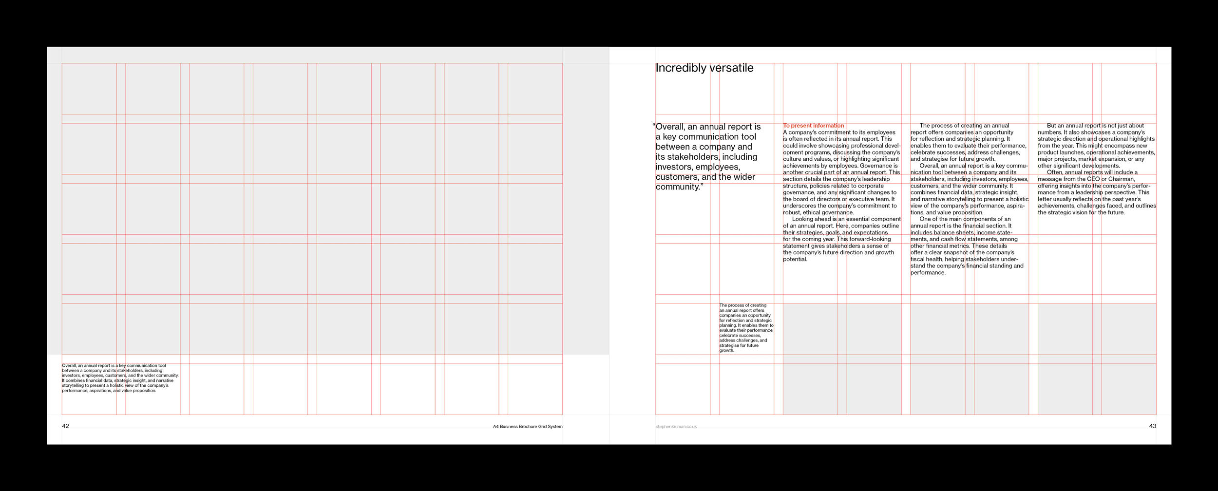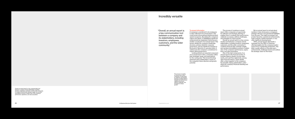 This A4 landscape typographic grid system / template has been designed for annual reviews, corporate reports and business brochures.