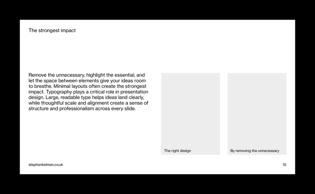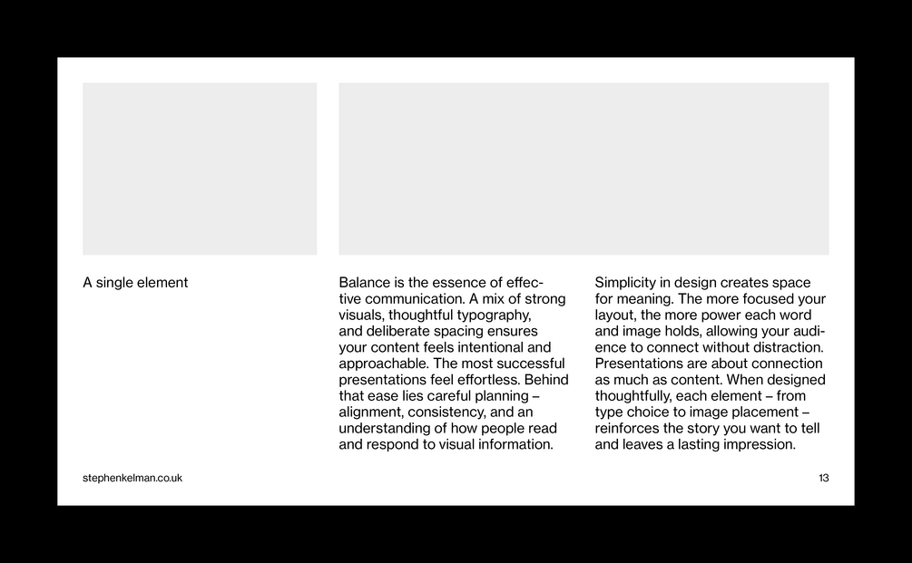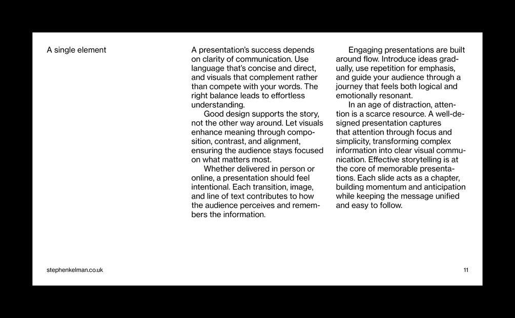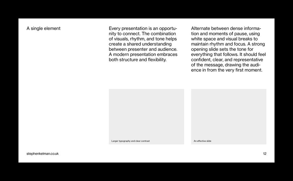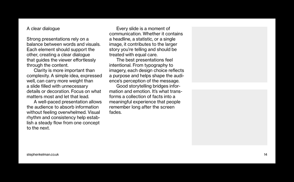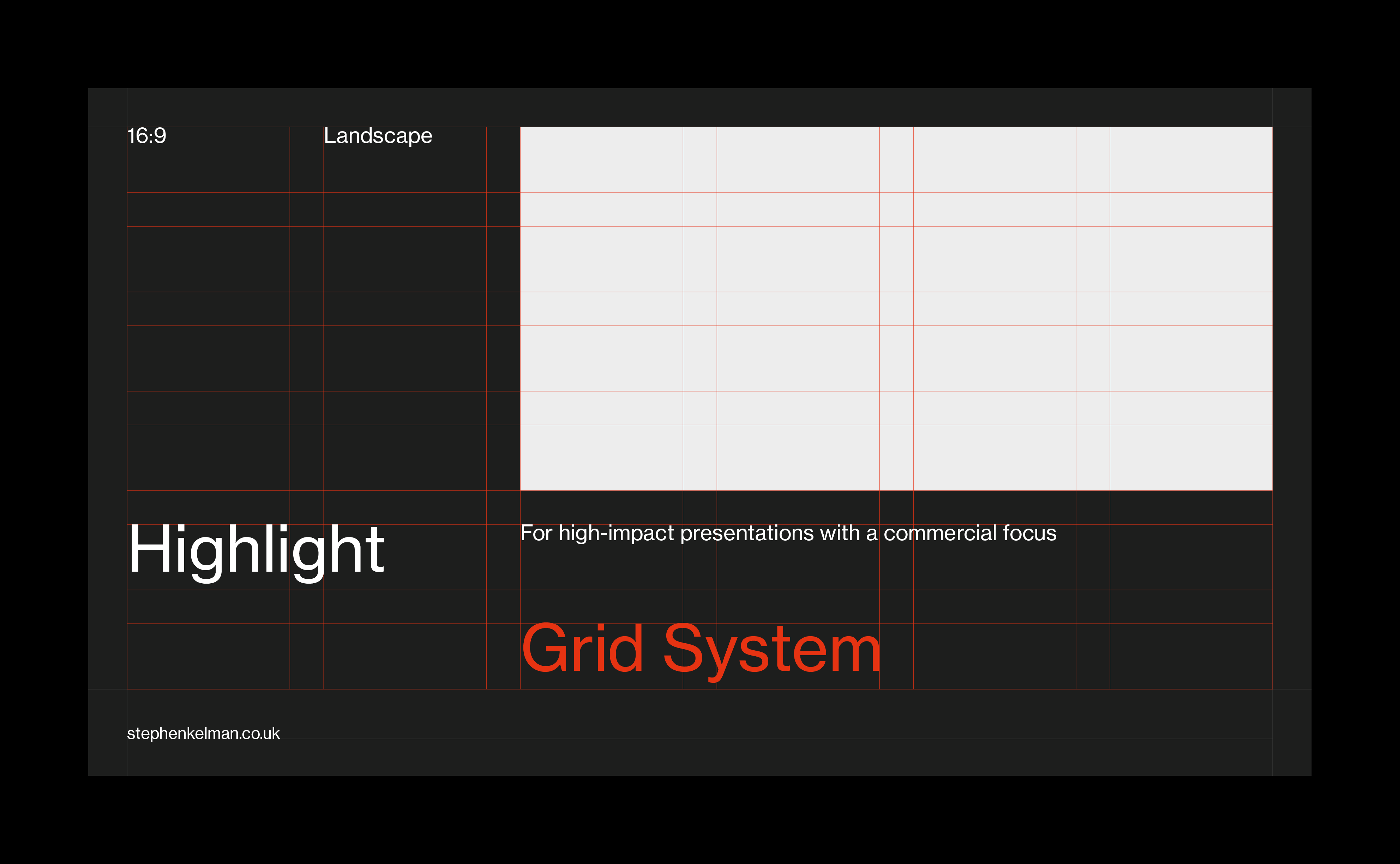 This typographic grid system has been designed for presentations with larger body copy – perfect for shorter form content. Featuring extensive style sheets this grid system will suit internal and external business communications – including pitch decks, business documents, creative presentations and more. For commercial presentations with longer-form content see the Insight Presentation Grid System.