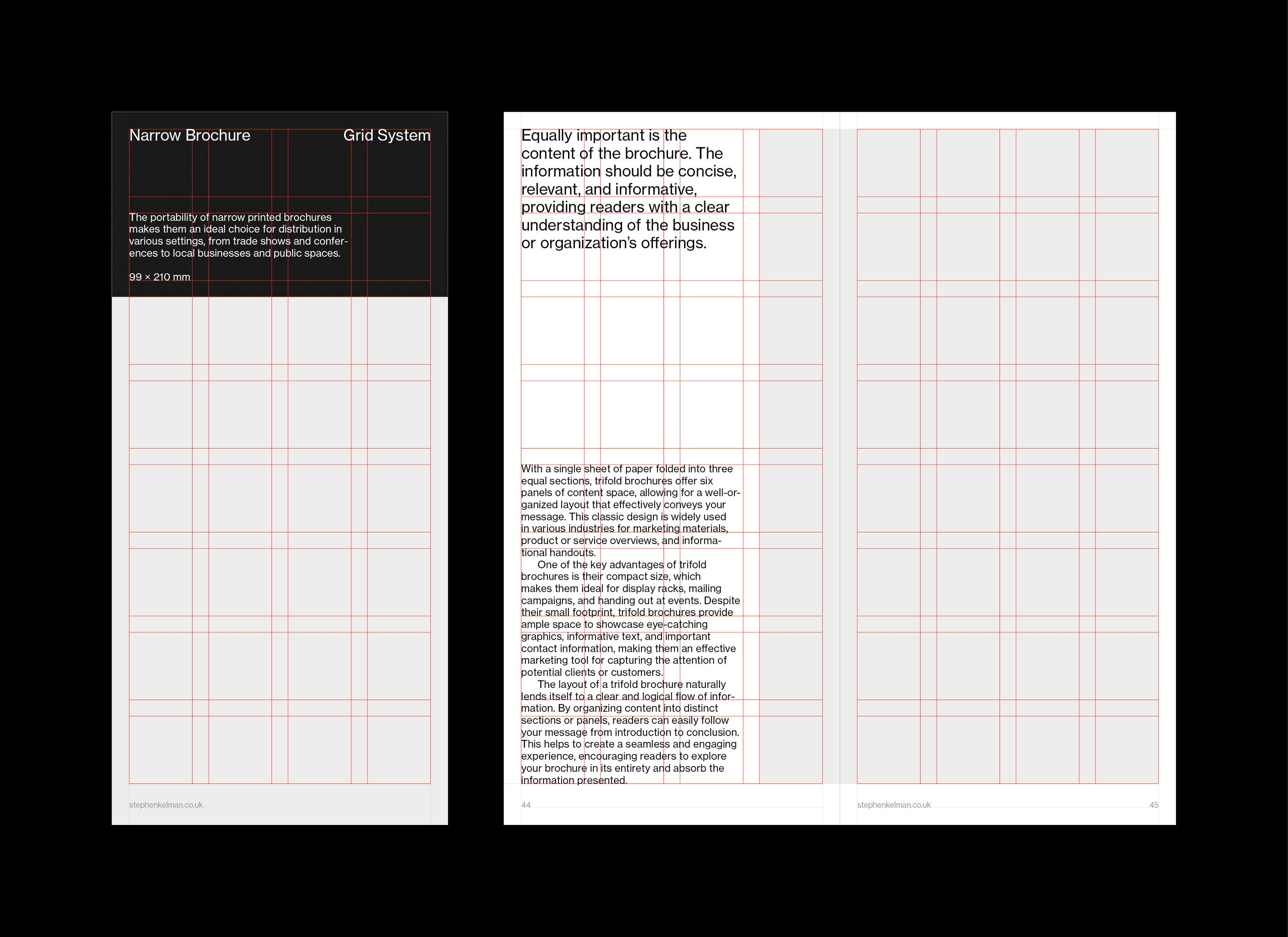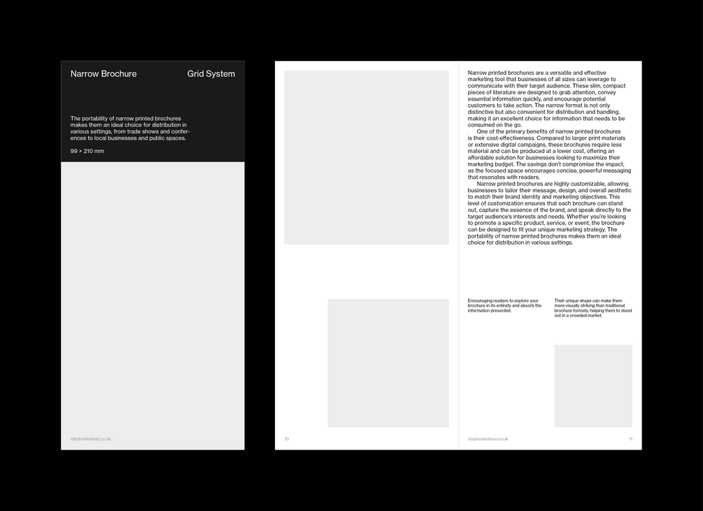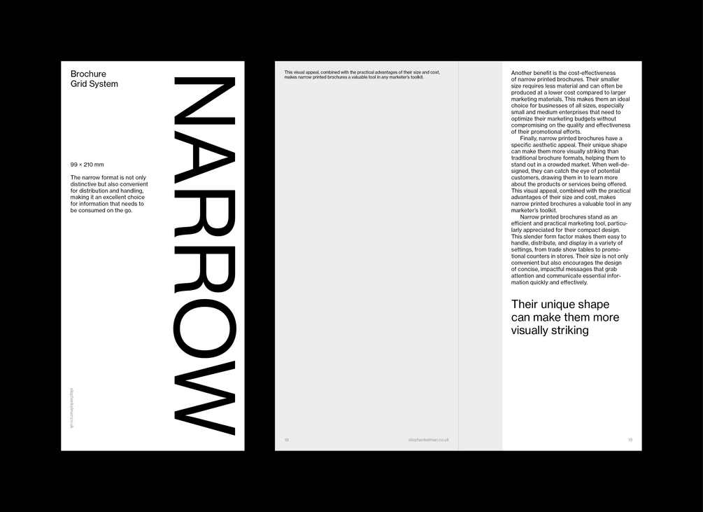 This typographic grid system and template have been designed for narrow-format brochures. These brochures are particularly suited to marketing for arts organisations and events.