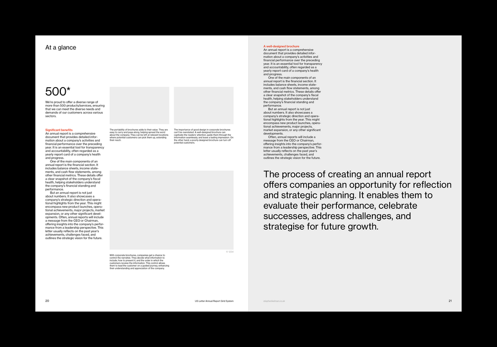 This US letter format typographic grid system / template has been designed for annual reviews and corporate reports.
